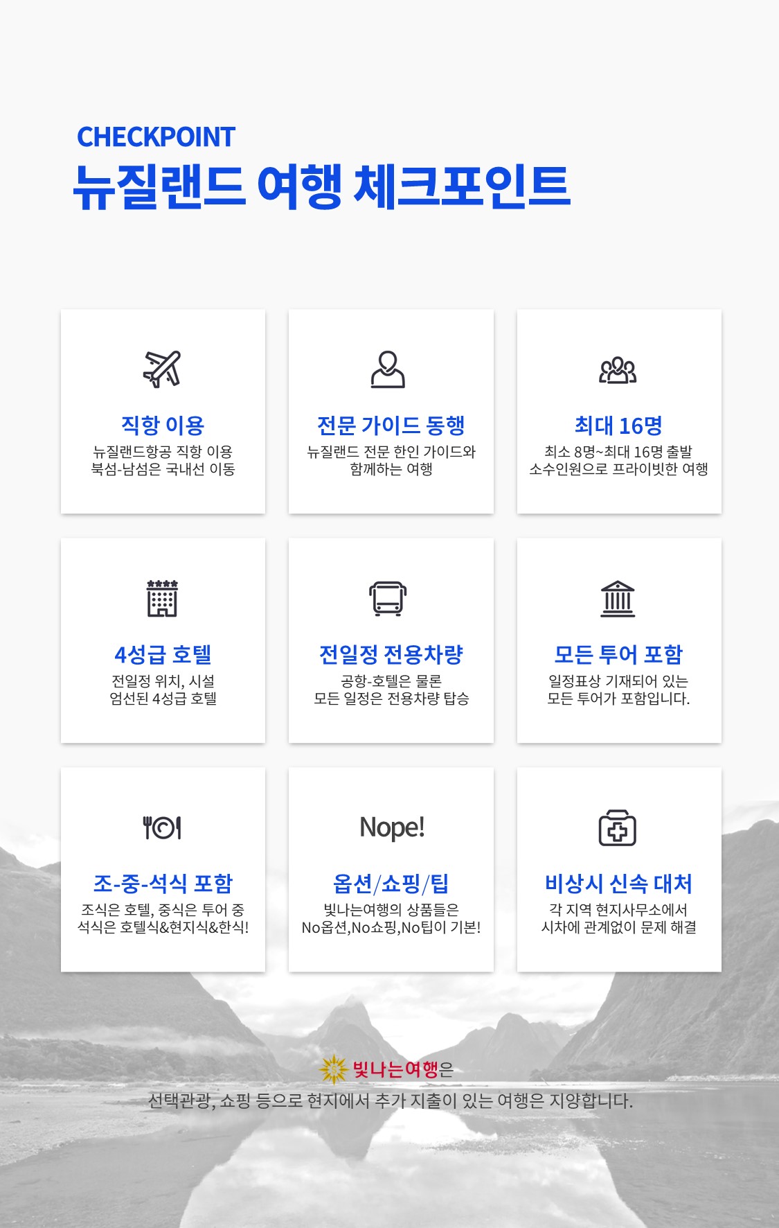 🔹 전 일정 4성급 호텔 (2인 1실) 🔹 전 일정 식사 🔹 뉴질랜드 국내선 2회 🔹 전 일정 전용차량 🔹 일정상 표기된 포함투어 🔹 한국인 가이드 동행 🔹 가이드 및 기사 팁 🔹 최대 3억원 여행자보험 (해외 출발 고객 불포함) 🔹 여권 커버, 네임택, 여행용 파우치, 멀티 플러그 증정 |