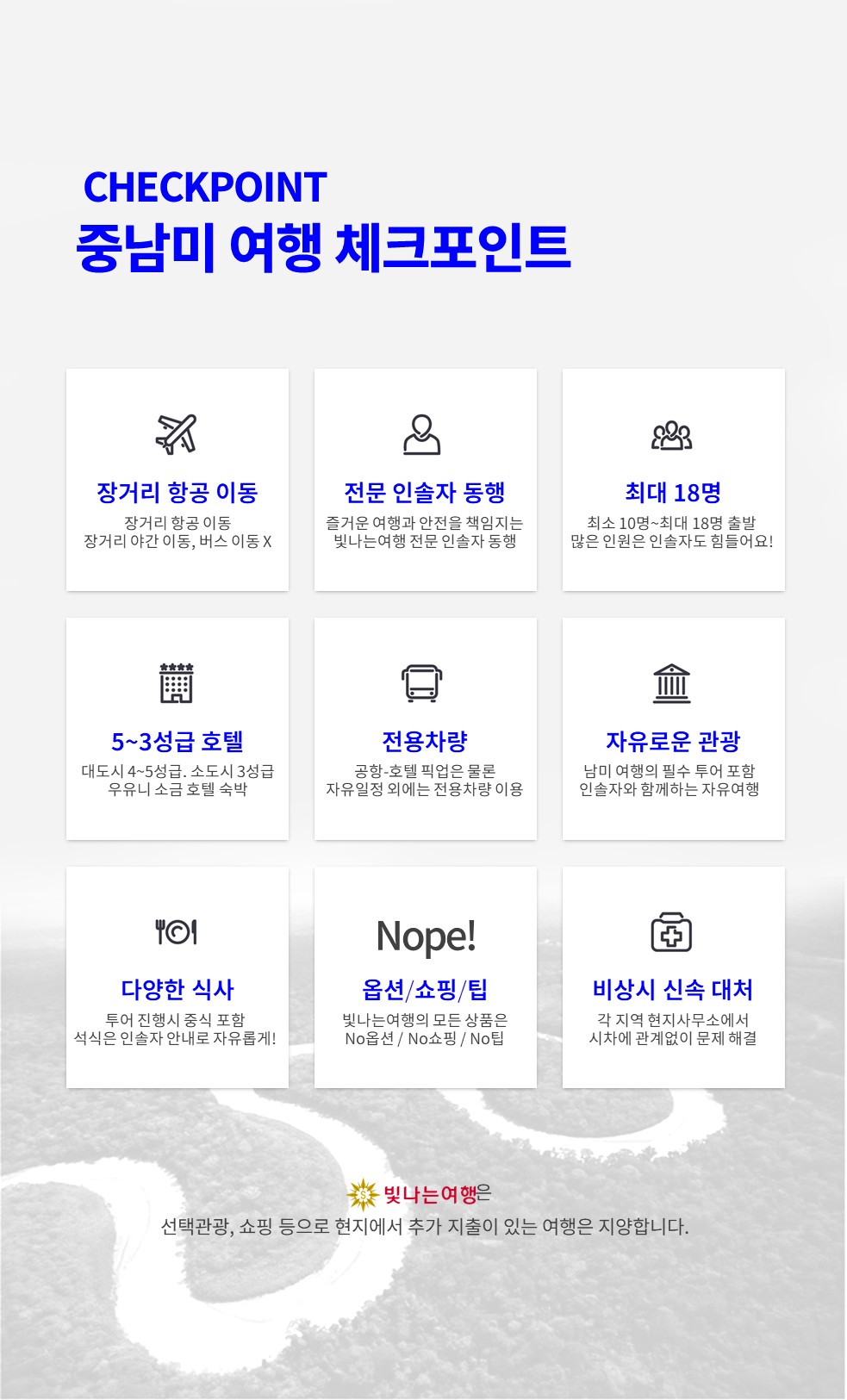 | ✈ 남미 상품은 국제선 항공 이코노미석 기준 포함된 상품가 입니다. (비지니스석 요청시 별도 문의) | |||