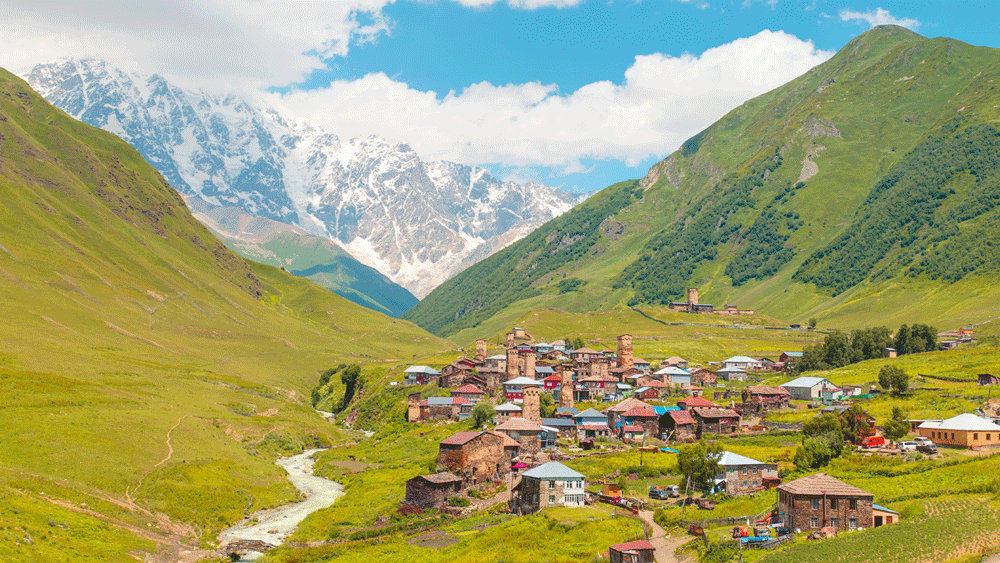 - 라마리아 교회 및 5.068m의 쉬카라 설산 조망, 동화 같은 풍경이 펼쳐지는 우쉬굴리 마을에서 자유 시간, 현지 가정식 중식