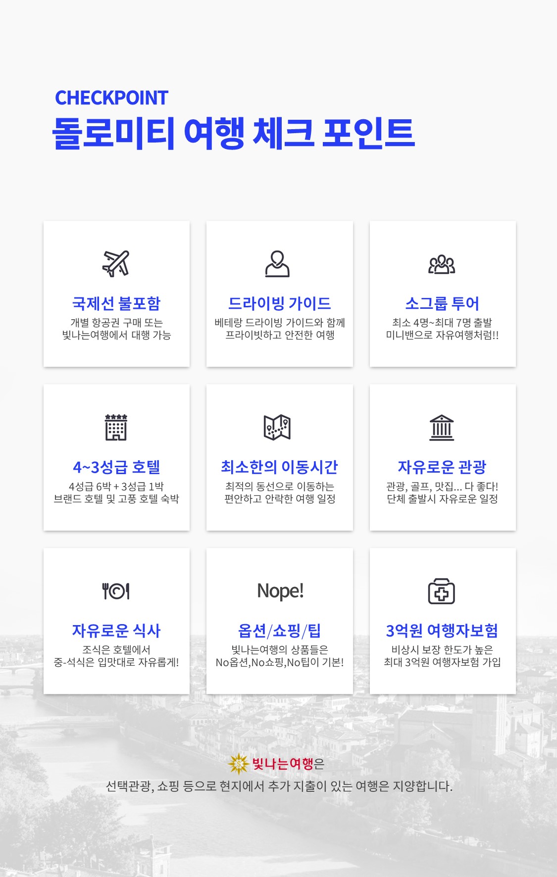 | 6. 여행 출발/추억 만들기공항 미팅 후 여행 출발, 여행 후에는 생생한 후기로 추억을 나누세요.