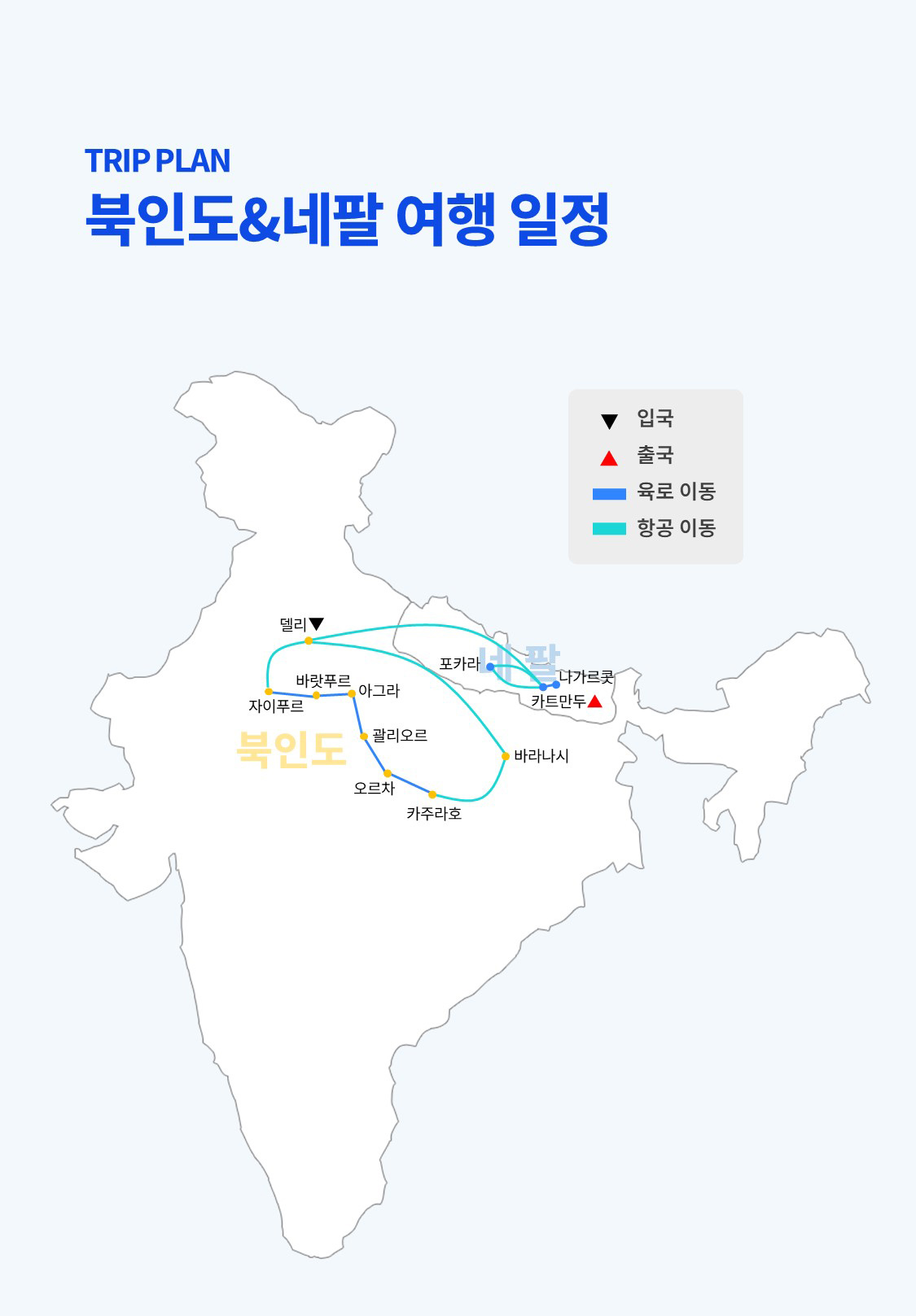 🔹인도&네팔 내 항공 이동 6회 🔹5성급 호텔 및 궁전호텔, 산장호텔 체험 🔹전 일정 식사 🔹일정상 포함된 투어 및 전용차량 🔹한국어 가이드 동행(15인 이상 출발시 한국인 인솔자 동행) 🔹1억원 여행자보험(해외출발 고객은 불포함) 🔹여권 커버, 네임택, 여행용 파우치 |